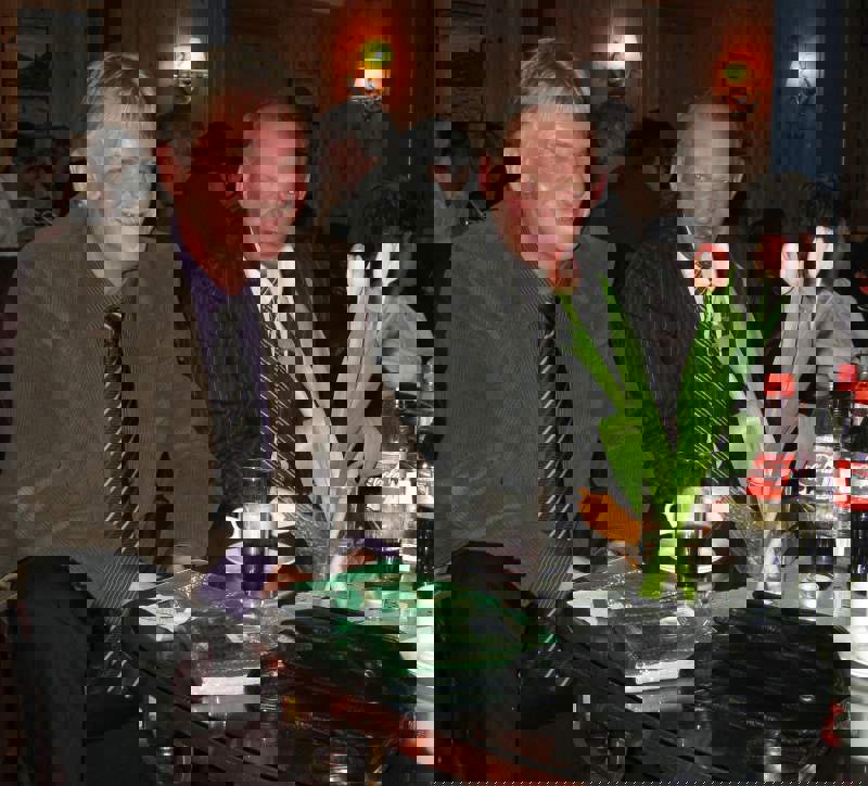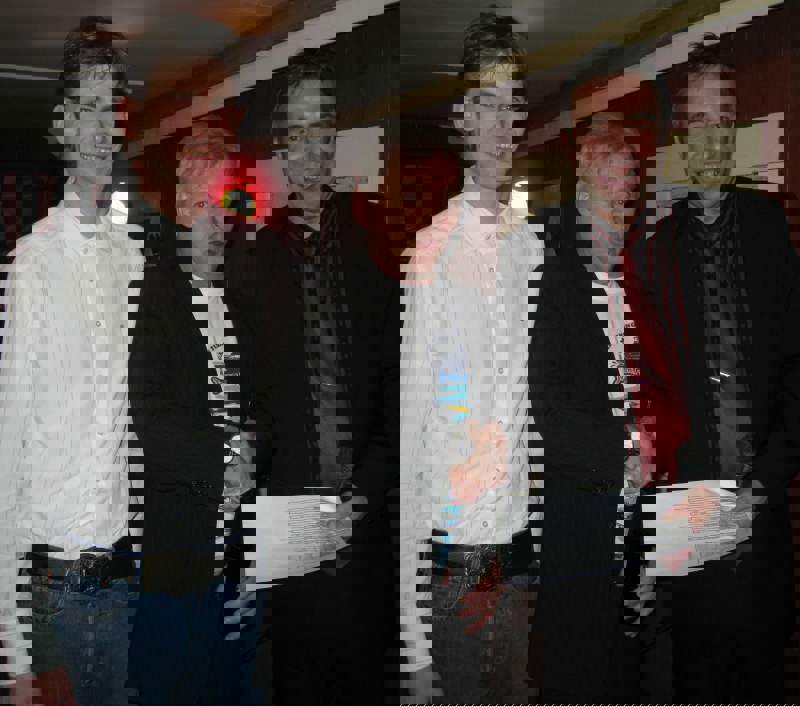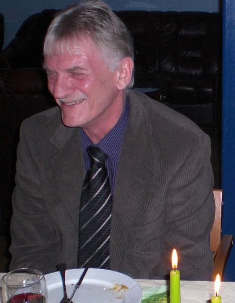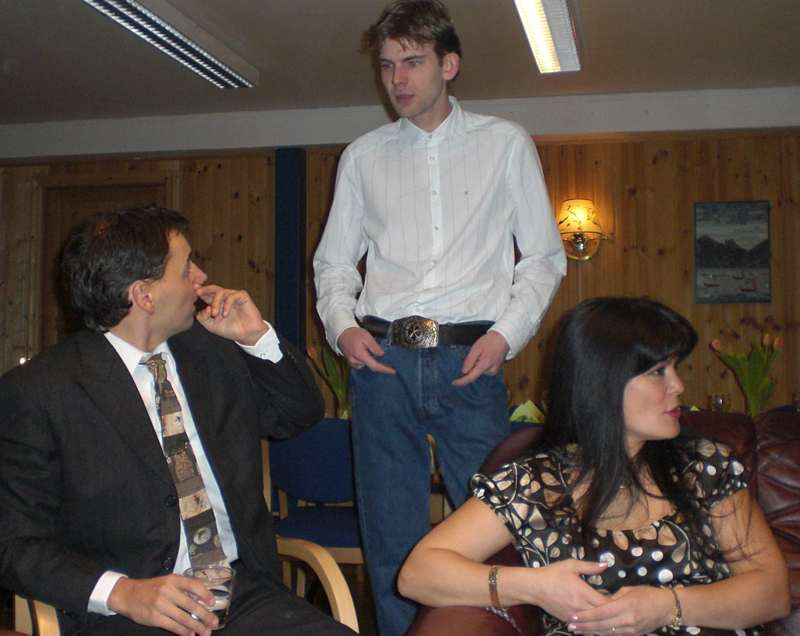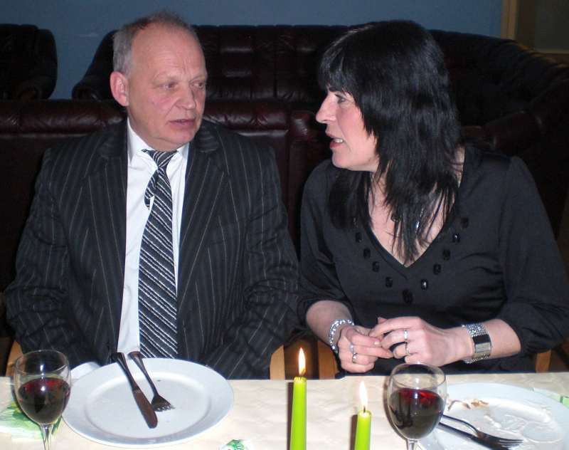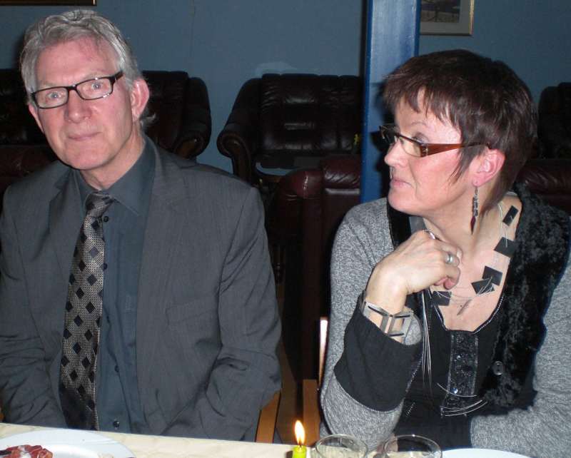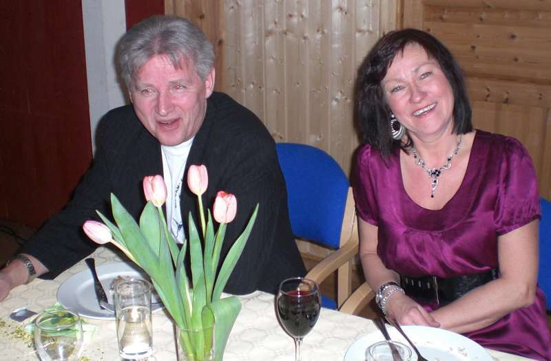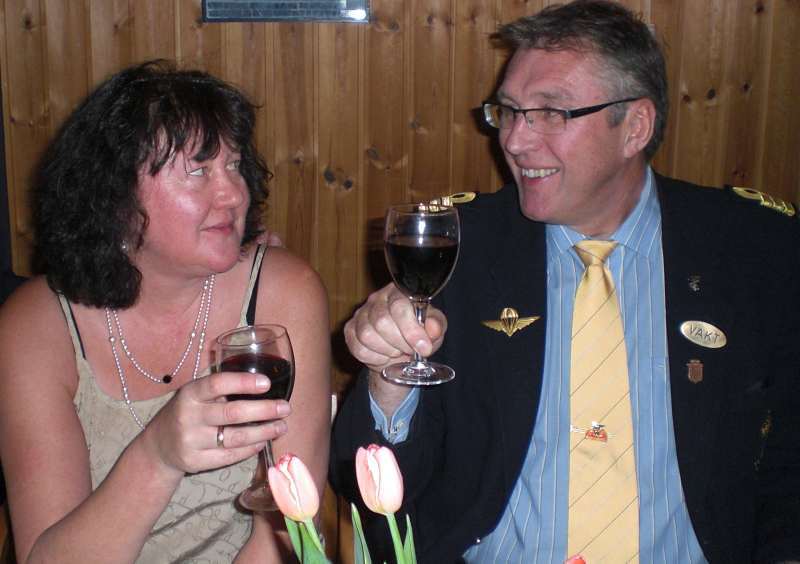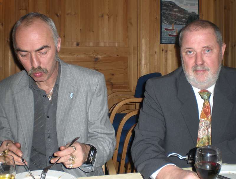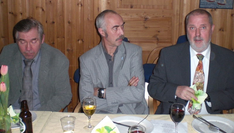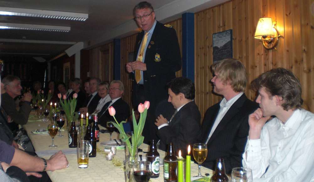 Vi ble tilslutt ca 35 feststemte gjester som ble ønsket velkommen av Per Arne. Først et minutts stillhet for å minnes de som hadde gått bort siste år. Dessverre er det ofte slik at noen går bort og jeg lot tankene gå til Jan Erik og Sigbjørn og noen av de fine opplevelsene som vi hadde hatt sammen. Men, livet må gå videre og Per Arne inviterte deltagerne fra VM i skreifiske fram til scenen. Dermed var sangkoret ………… stiftet. Til toner fra Per Arnes gitar, kom så deres første opptreden med "Til torskens pris". Dette var artig og satte en god stemning blant gjestene før vi kunne forsyne oss av et rikholdig og variert koldtbord. Med vin eller øl i glasset kunne vi alle prate og kose oss. Generalen, Svein Erling holdt en rungende og engasjert tale som også inneholdt takk for maten ispedd litt på kanten humor. Som avslutning sang vi ” Hver gang vi møtes, så har vi det bra”.