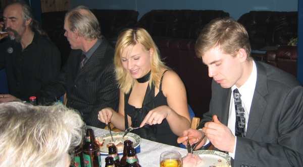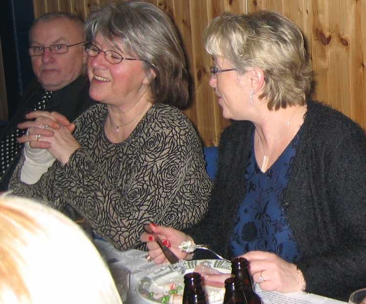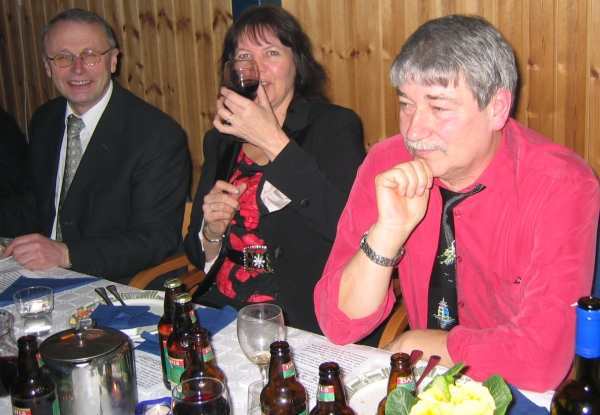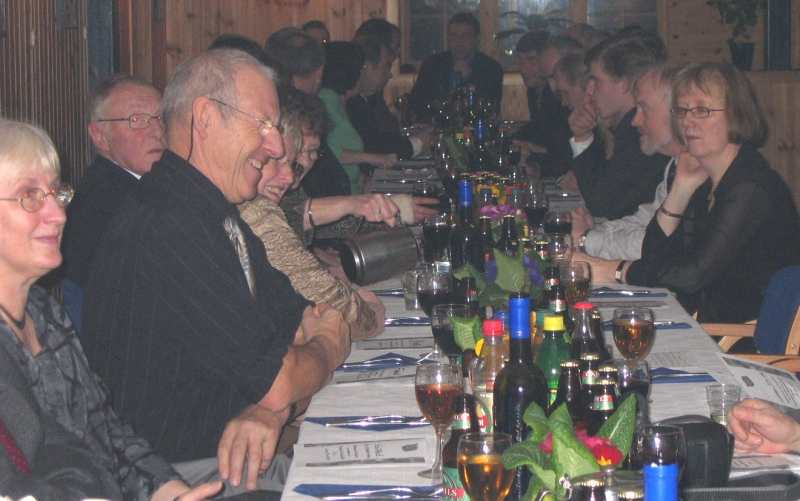 Timingen var upåklagelig, og kl 1930 var et veldig passende antall medlemmer og medløpere benket ved langbord. Klæt catering eller der omkring hadde besørget et utmerket festbord. Øl, vin og mineralvann var dertil egnede ledsagere til maten. Underveis ble diverse viser avsunget. Ja, en av visene kunne sogar blitt heller vovet om man skulle synge den senere på kvelden.