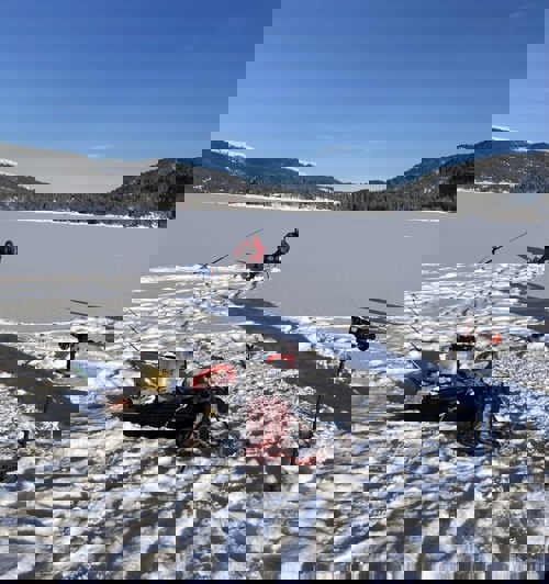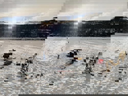 Jeg og Midhet var fremme i Prestvågen rundt 09:20, og vi så med én gang at folk allerede var ute på isen. Bjørn, Fida og Adam hadde startet, men rapporterte om litt tregt fiske. I tillegg skulle vi få med oss to nye medlemmer: Enno Dreier og gutten hans som snart fyller 12. Mor og “sønn nummer to” ble også med, så det ble en skikkelig fin familiedag på sjøisen.